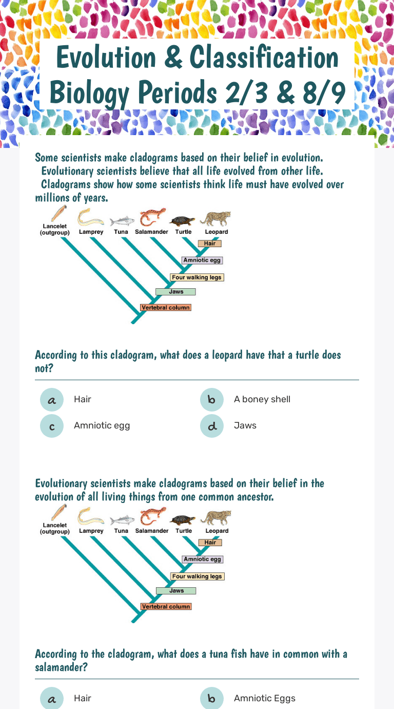 Phylogeny = the study of evolutionary relationships; Use a different color for your answers. Classification, and why cladistic classification is preferred by modern biologists. Includes a video and quiz! Phylogenetic analysis lab worksheet, page 1 of 11 .